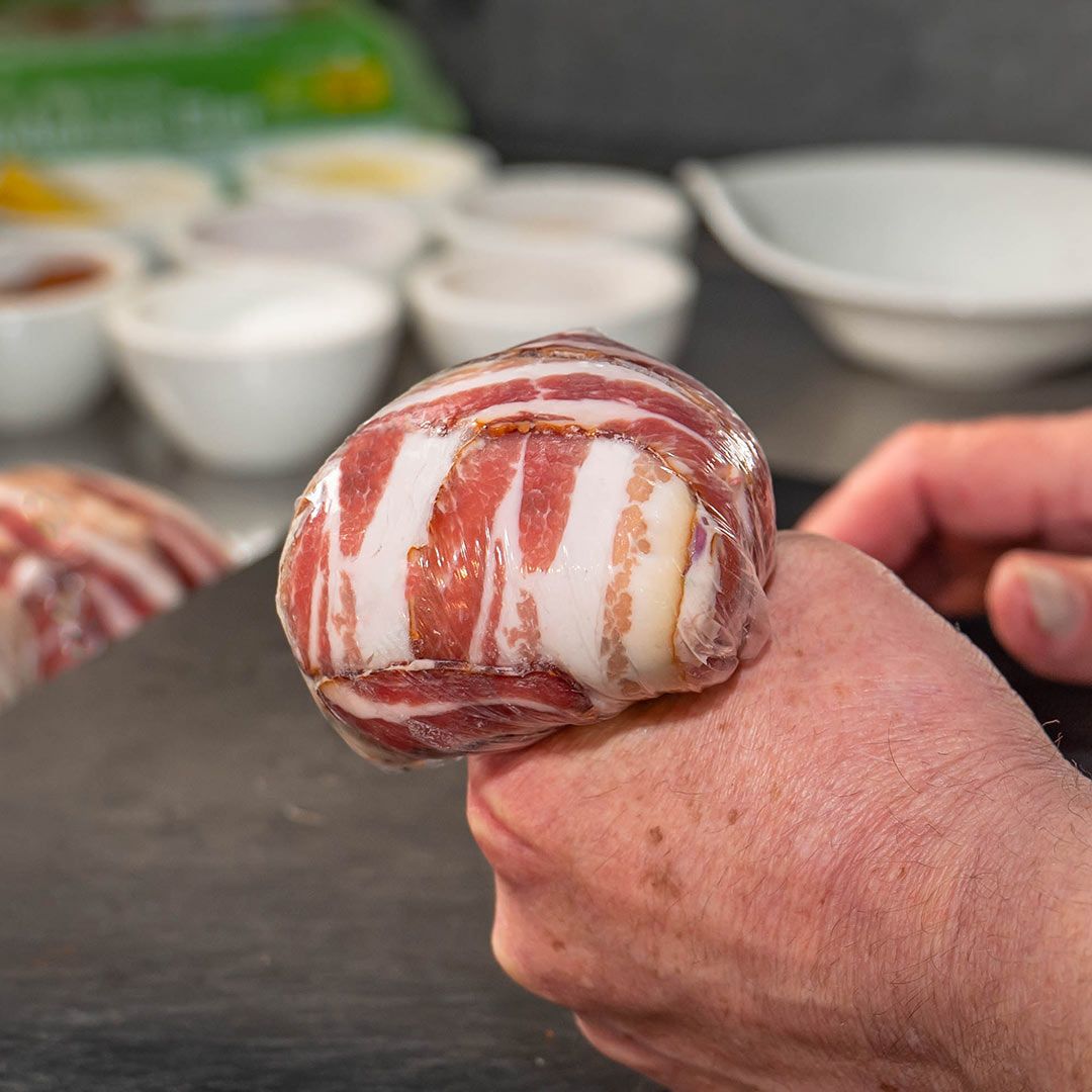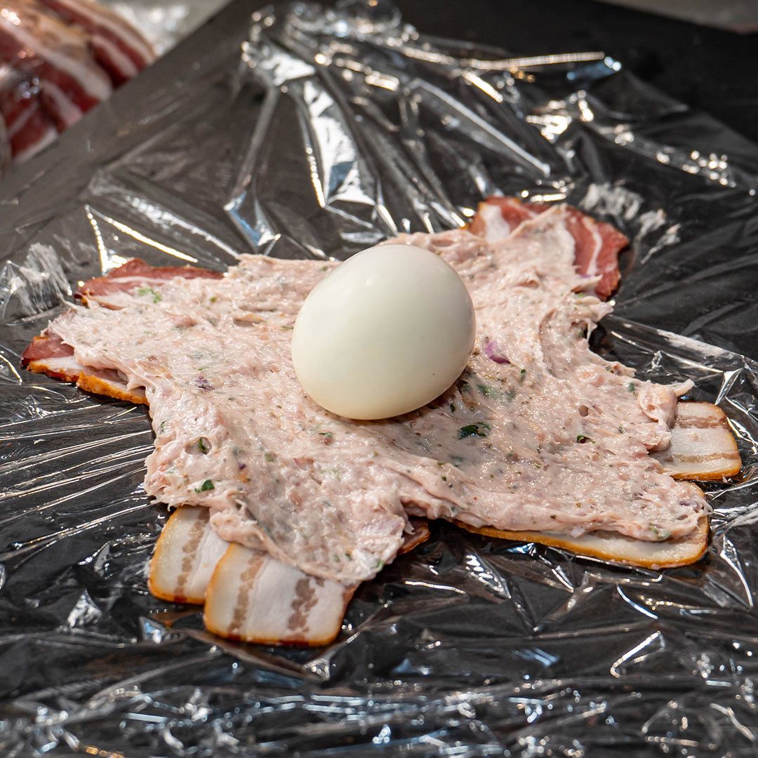 5 frische Bratwürste1 Bund Petersilie1 Zwiebel5 Eier1 Grillsauce Allgäu Whisky24 Scheiben SpeckSalz & PfefferFrischhaltefolie